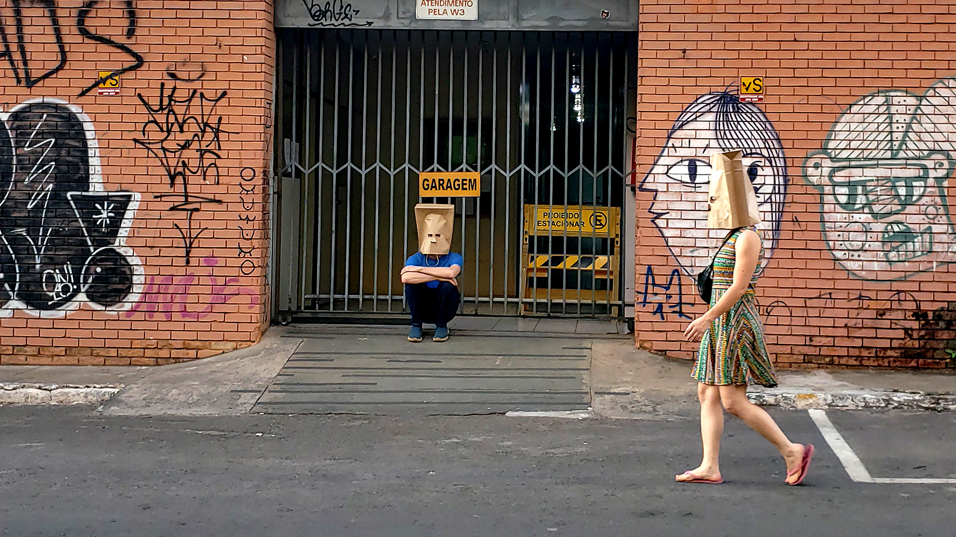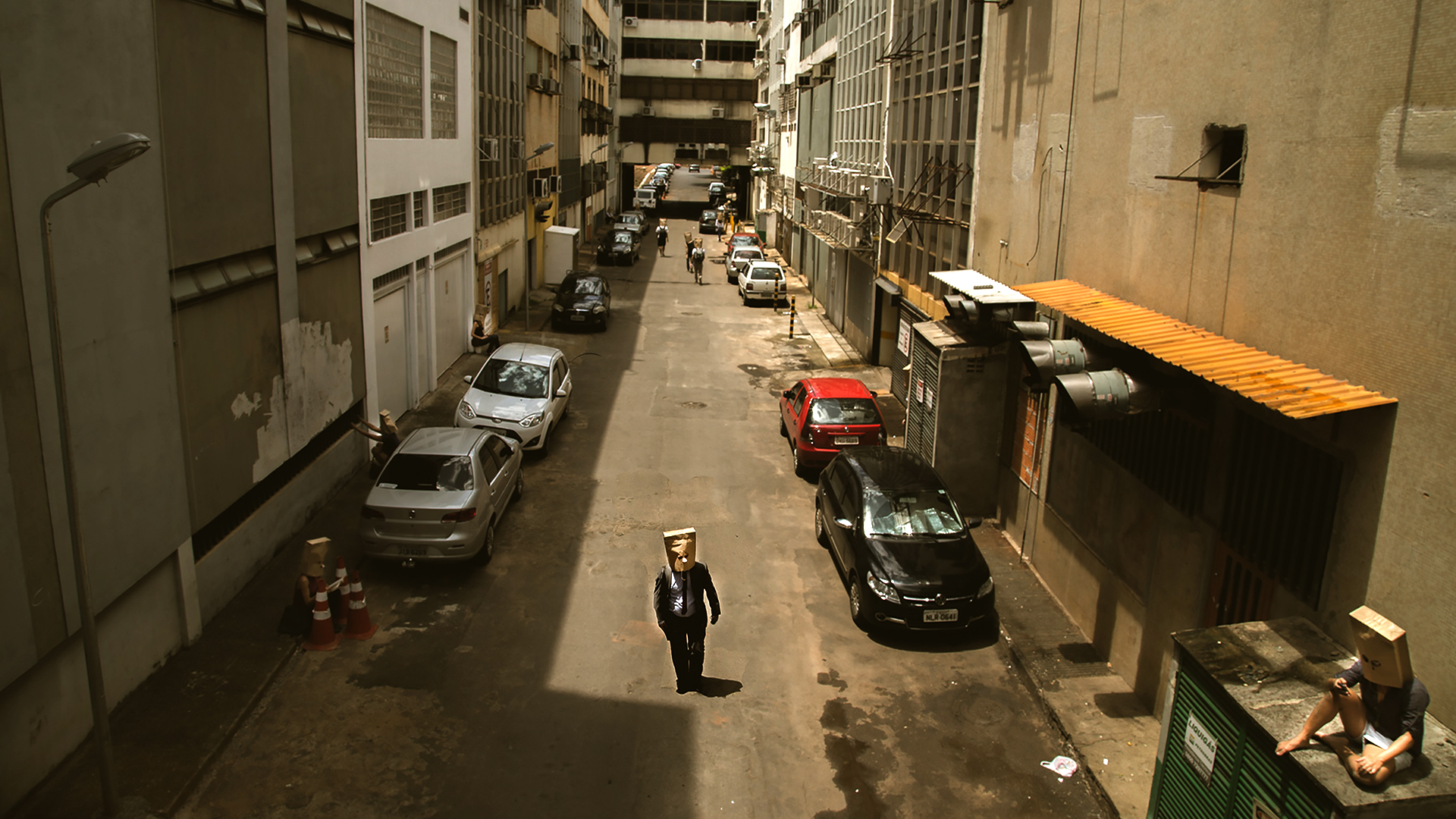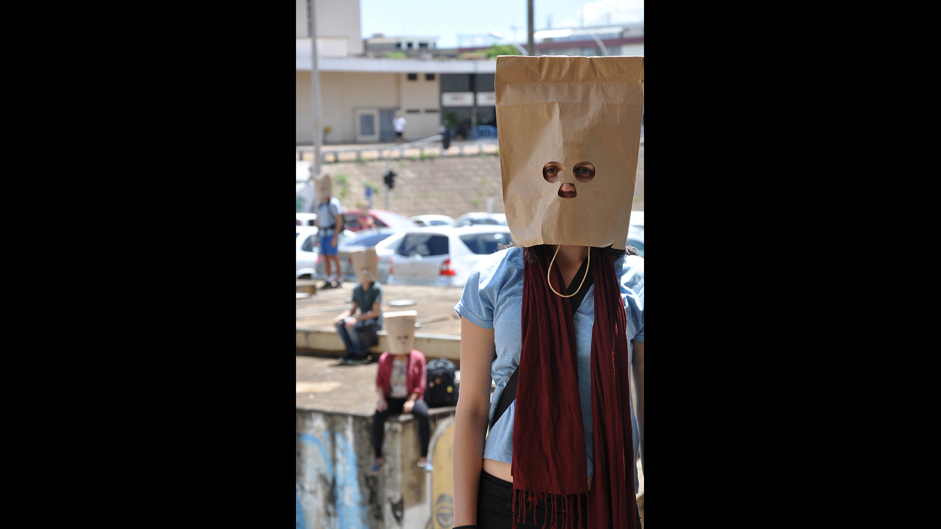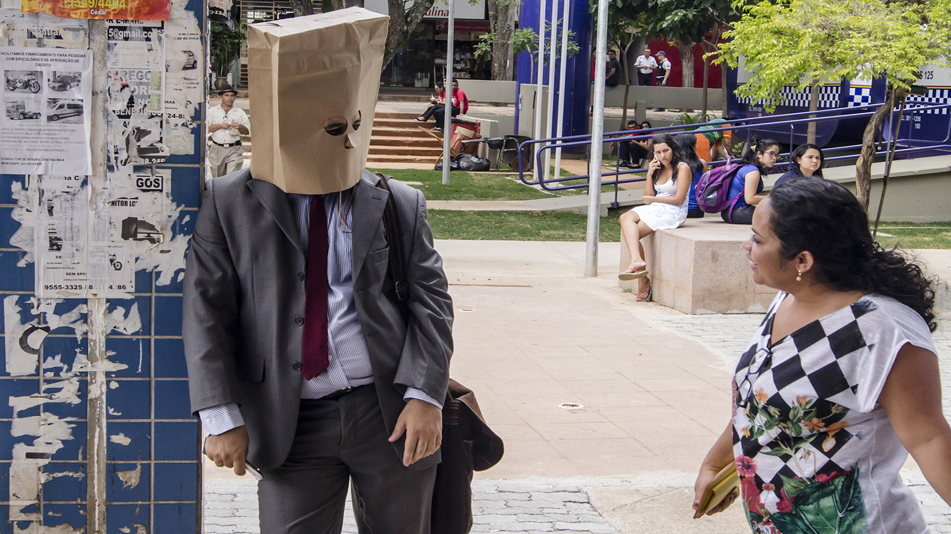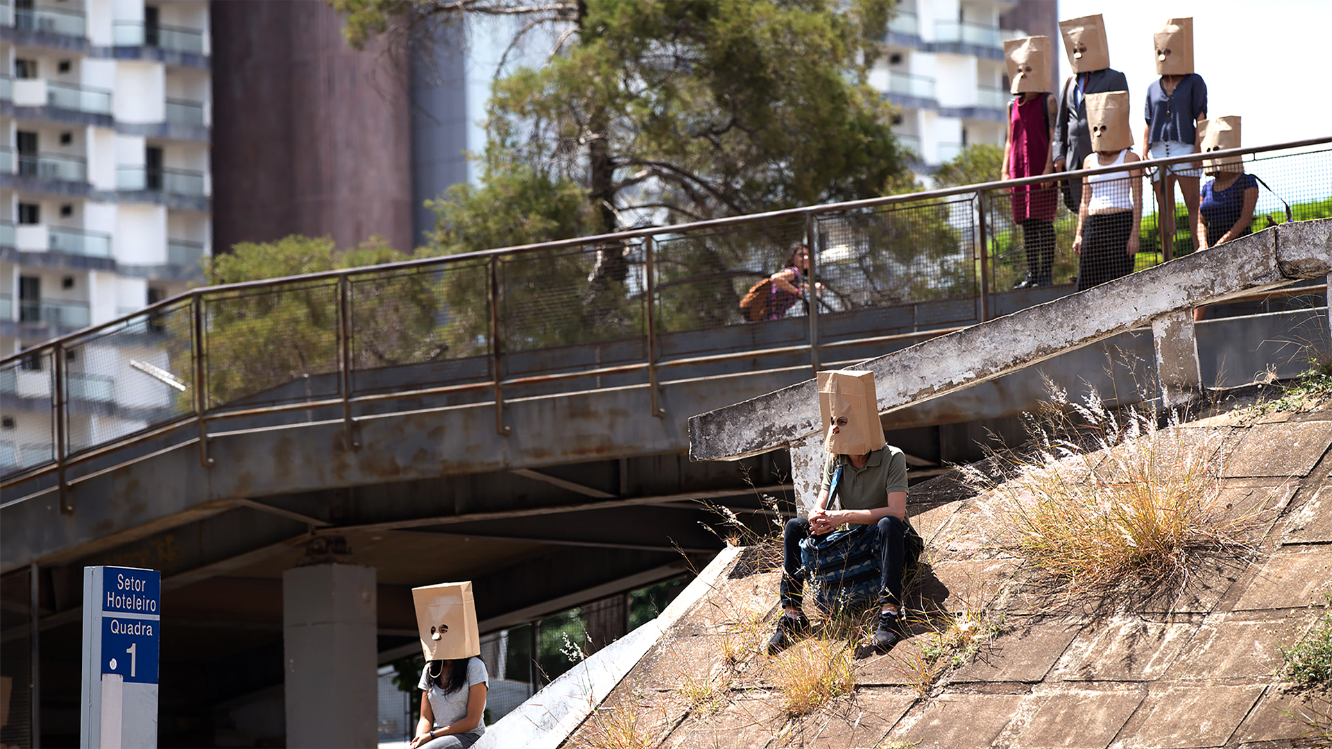 SACOLAS NA CABEÇA é uma intervenção urbana onde pessoas andam pela cidade com sacolas de compras na cabeça. O ambiente das ruas é modificado com a invasão de seres que desafiam a lógica e instigam a realidade. Suas presenças criam um mundo paralelo.